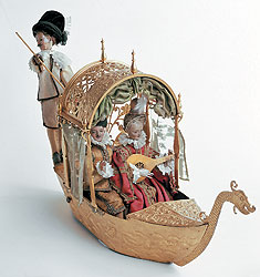 Для современного человека из всего репертуара кунсткамер наиболее любопытными выглядят хитроумные игрушки-автоматы — украшение раздела рукотворных диковинок (artificialia). Габсбургская механическая гондола, изготовленная в Аугсбурге в 1600 году, "плавает" по столу, в то время как гондольер взмахивает веслом, пассажиры жестикулируют и кивают головами, а встроенный механизм имитирует звуки лютни |
