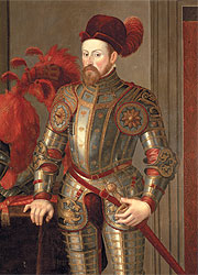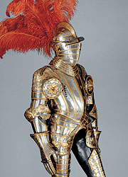 В кунсткамерах часто хранились парадные рыцарские доспехи. Особую ценность такому экспонату придавало участие в крупных сражениях. Иногда доспехи экспонировались вместе с портретом монарха, закованного в те же самые латы,— как в этом случае, когда эрцгерцог Фердинанд II Тирольский (слева) изображен на портрете именно в доспехах "Боевой гарнитур с орлами" (справа, Инсбрук, 1547; оба экспоната из собрания Габсбургов) | |