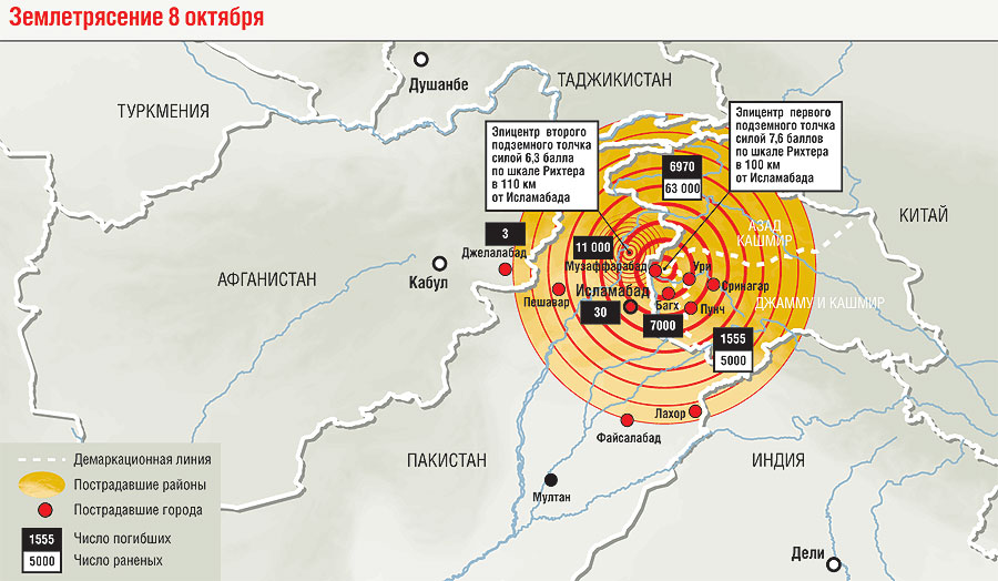 Во всех магазинчиках Исламабада работают телевизоры, но показывают они не привычные индийские мелодрамы (которые тут постоянно смотрят все, несмотря на политическое противостояние двух стран), а новости. Всех интересует, что происходит в наиболее пострадавших районах, прежде всего в Музаффарабаде — административном центре Азад Кашмира. Пакистанская пресса называет Музаффарабад "городом мертвецов". Как и во многих других городах Пакистана, дома в Музаффарабаде построены из сырцового кирпича. От толчков они полностью разрушились. Примерно половина города лежит в руинах, в том числе все четыре городские больницы. В Кашмире без крыши над головой осталось более 2 млн человек. А если верить народным приметам, там ожидается ранний снег.