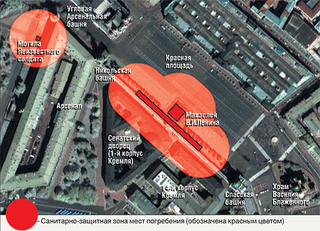 Правила размещения кладбищ Одновременно "Рекомендации о порядке похорон и содержании кладбищ в Российской Федерации", принятые на научно-техническом совете Госстроя 25 декабря 2001 года, не допускают в санитарных зонах кладбищ "устройство зданий и сооружений с длительным пребыванием (свыше 50 часов в месяц) людей, гаражей и хозпостроек, водозаборов и колодцев для хозяйственно-питьевых нужд, детских игровых и спортивных площадок и сооружений". Предложения по телу товарища Ленина