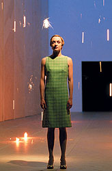 Игровая площадка у него похожа на подиум для показов мод, она ограничена высокими стенами и сужается в глубине. И персонажи, появляющиеся вдалеке, приближаются к зрителю, будто модели в одеждах из новых коллекций. События словно раскручиваются сами собой, и музыкальной метафорой этого драматического процесса становится нескончаемый вальс, навеянный мелодией из фильма Вонга Кар-Вая "Любовное настроение". Незабываемый мотив материализуется в заглавной героине, загадочной молодой женщине в зеленоватом платье. В ней будто спрятан источник смертоносного силового поля: все попавшие под ее власть сначала вознаграждены сильнейшим чувством, а потом наказаны испепеляющим страданием. Поцелуй в этом спектакле может убить, взгляд — сжечь, слово — сбить с ног. Не случайно, что в самой важной сцене постановки свет на сцене зажигается так ярко, что публике приходится зажмуриться.