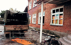Второй взрыв действительно произошел в самом зале, точнее, под его ближайшим к основному зданию окном, образовав в полуметровой стене пролом, бегством через который спасалась часть заложников. Как и в первом случае, разорвалась не бандитская мина, так как пол рядом с проломом не пострадал, чего нельзя сказать о воронке под баскетбольным щитом, куда упала висевшая на кольце бомба.