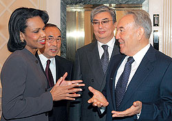 ФОТО: REUTERS Благосклонность Вашингтона (на фото — президент Казахстана вместе с госсекретарем США Кондолизой Райс) Назарбаев заслужил, пойдя на значительные уступки в нефтяной сфере |