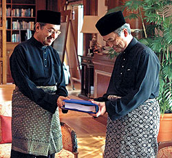 ФОТО: АР/HO Премьер-министр Малайзии Махатхир Мохамад (слева) сдает дела Абдулле Ахмаду Бадави (2003 год) |