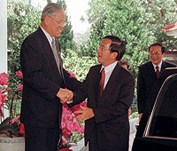 ФОТО: АР Чэнь Шуйбянь (в центре) сменяет Ли Дэнхуэя (слева) на посту президента Тайваня. Тайбэй, март 2000 года |