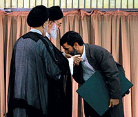 ФОТО: АР Новый президент Ирана Махмуд Ахмади-Нежад (справа) принимает власть из руки аятоллы Хаменеи (слева — бывший президент Ирана Мохаммад Хатами). Тегеран, август 2005 года |