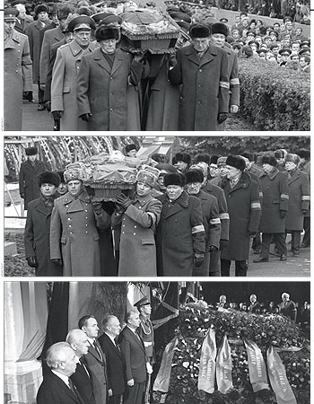 ФОТО: BANK.COM Советский ритуал восхождения на вершину власти (сверху вниз): Ю. В. Андропов хоронит Л. И. Брежнева (Москва, ноябрь 1982 года), К. У. Черненко хоронит Ю. В. Андропова (Москва, февраль 1984 года), М. С. Горбачев хоронит К. У. Черненко (Москва, март 1985 года) |