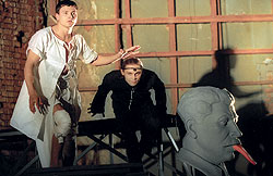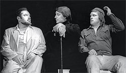 "Мастер и Маргарита" в постановке Юрия Любимова на Таганке отличался выразительными актерами (слева направо — Александр Сабинин (Берлиоз), Вениамин Смехов (Воланд) и Михаил Лебедев (Бездомный) |
