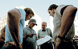 ФОТО: REUTERS/ UNIVERSAL STUDIOS Стивен Спилберг объясняет актерам, снимающимся в фильме "Мюнхен", как должно выглядеть лицо еврейской национальности в изменившихся политических условиях |
