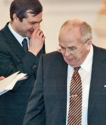 ФОТО: ДМИТРИЙ АЗАРОВ Кремлевские кураторы Общественной палаты во главе с Владиславом Сурковым не нашли лучшей кандидатуры на пост ее секретаря, чем Евгений Велихов (справа) |