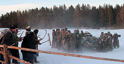 Немецко-фашистский оккупант, входящий в русскую избу с хрестоматийным "Курки, млеко, яйки!", в современном российском кино превратился в безобидного страдальца (кадр из фильма "Последний поезд" Алексея Германа-младшего), погибающего в плену среди снегов. |
