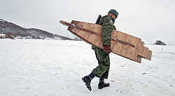 "Подразделение, выдвинуться на огневой рубеж!"-- кричит какой-то майор. Солдаты бросаются на снег и целятся в мишени. "Огонь!"-- командует майор. Солдаты стреляют по дальним целям. Попали они или нет, я не вижу. Мишени обычные, на попадание не реагируют.