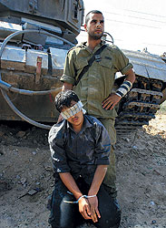 Последние недели Израиль ведет войну на два фронта — в секторе Газа с "Хамасом" (на фото-- пленный палестинец) и в Ливане с "Хезболлой" |