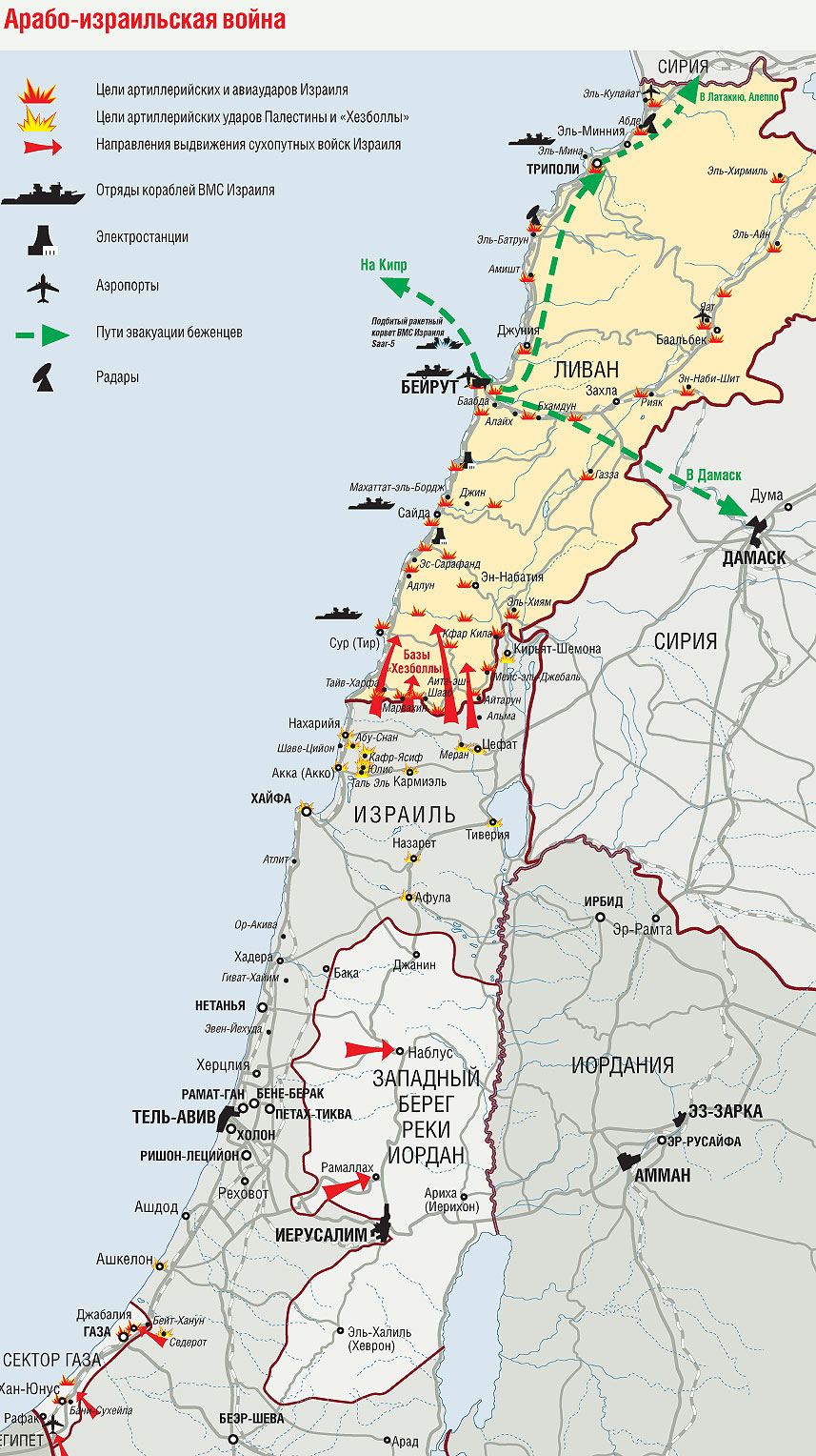 Проводя военные действия на двух направлениях — в Газе и Ливане,— Израиль открыл еще и третий фронт, информационный. Израильские военные, ссылаясь на данные разведки, неустанно говорят о том, что непосредственную помощь "Хезболле" оказывает Иран. Большое количество оружия на самолетах доставляют в Дамаск, а оттуда на грузовиках — к ливанской границе. По данным израильских спецслужб, в руки боевиков шиитской радикальной организации попали баллистические ракеты иранского производства "Зелзал-2".