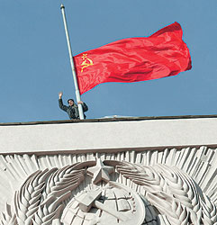 ФОТО: ПАВЕЛ СМЕРТИН 7 ноября 2003 года коммунист Армен Бениаминов совершил восхождение на крышу Госдумы и надругался над флагом России, заменив его флагом СССР. За это он получил от российской правоохранительной системы сотрясение мозга, перелом ребер и один год тюрьмы условно |