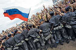 ФОТО: АЛЕКСАНДР МИРИДОНОВ "Полотнище из трех равновеликих горизонтальных полос", если в него вкраплены какие-либо иные элементы, государственным флагом РФ уже не является, и его использование законом никак не регламентируется (на фото — выражение фанатических чувств поклонниками рок-группы "Пилот") |