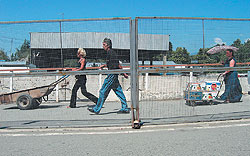 ФОТО: БОРИС ВОЛХОНСКИЙ Путешественники должны преодолевать границу между Россией и Абхазией пешком. Зато багаж местные жители предлагают прокатить на тележке (тариф — 50 руб. за одно место) |