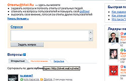 Проект "Ответы" не является изобретением специалистов Mail.ru. В интернете уже не первый месяц действует несколько аналогичных систем, по большей части англоязычных. Самая известная принадлежит компании Yahoo — Yahoo Answers (www.answers.yahoo.com). Но и на этом освоенном поле Mail.ru удалось проявить некоторое новаторство: например, снабдить "Ответы" системой подписки. Благодаря ей пользователи могут получать интересующие их ответы по электронной почте.
